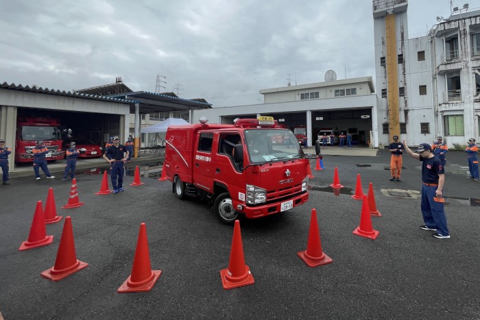 続いて、消防車を後退しながらのスラローム訓練です。誘導者を1人付けて確実な通過を目指します。