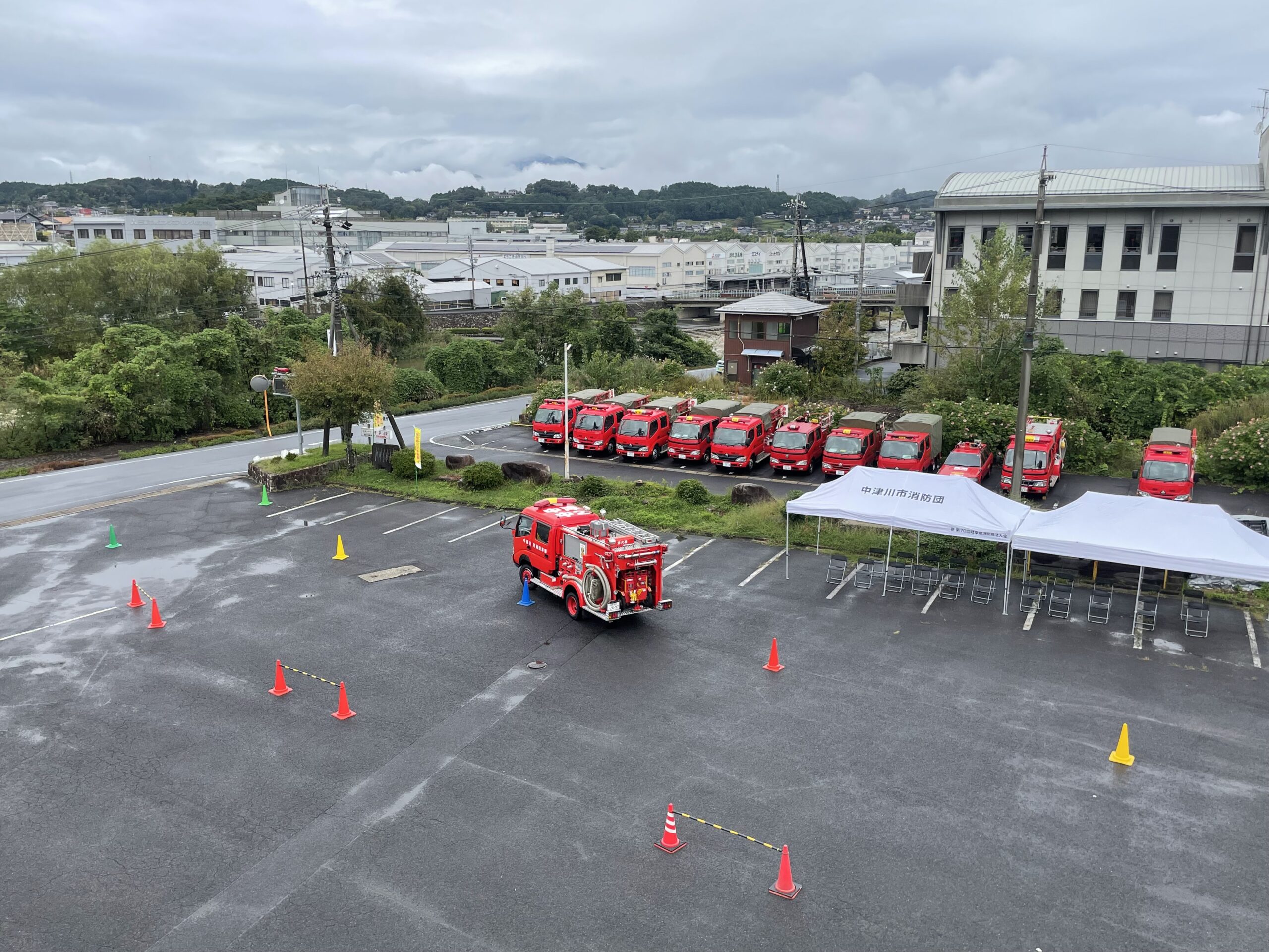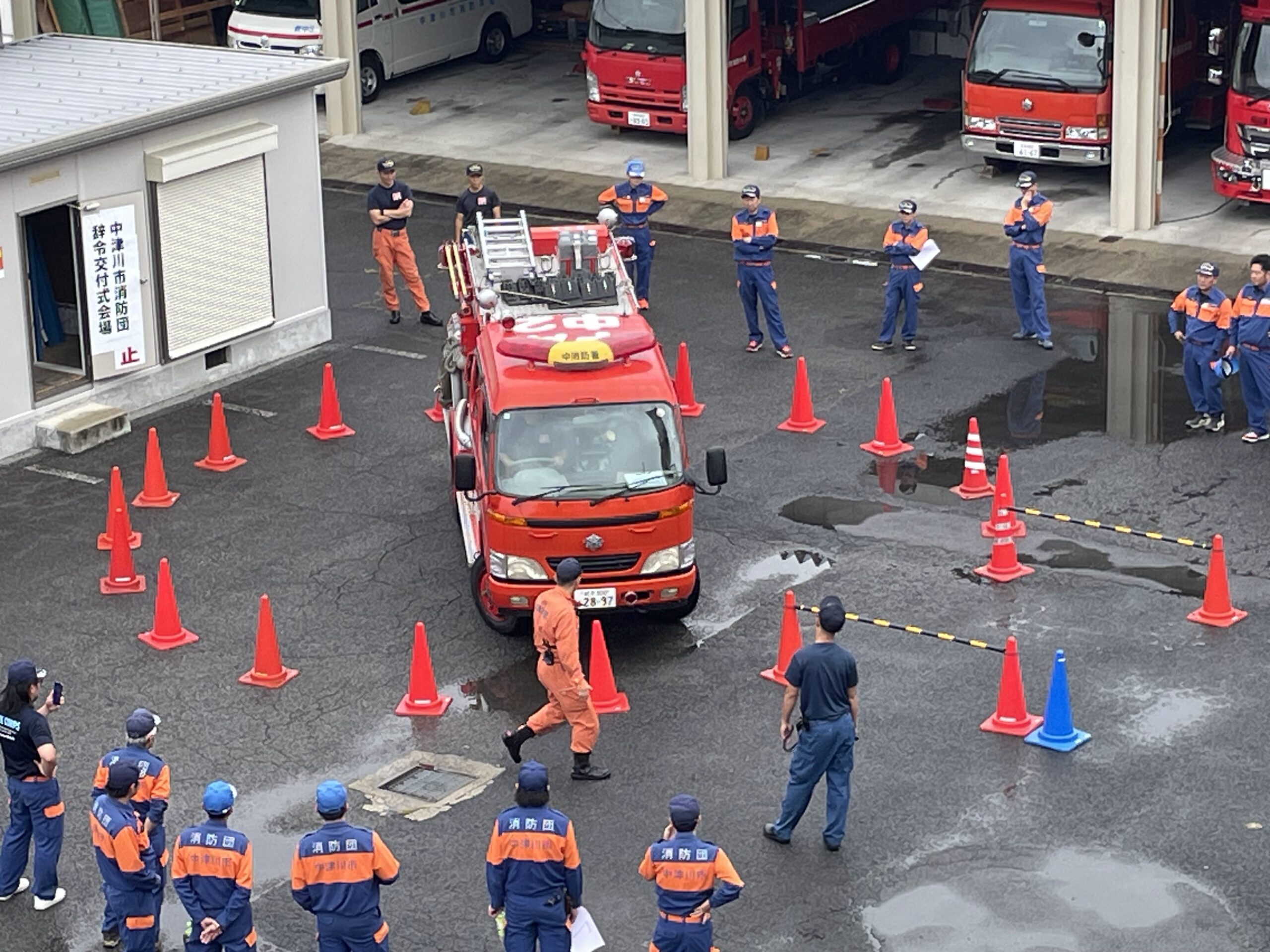 コースは消防本部駐車場を使って行われました。たこつぼの中に車両を頭から入り、車体をたこつぼの中で切り返して頭から出ると言う訓練です。なかなかの難題です。それぞれの団員が腕を振るいました。実際の災害現場でも起こりうるかもしれません。