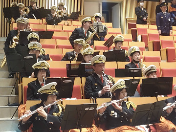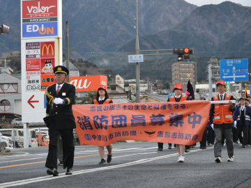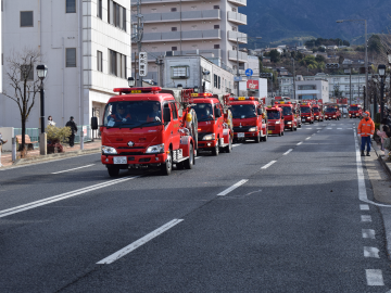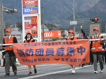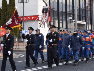 その後、正午より中津川駅前までを分列行進しました。強風のため、苗木分団階梯操法、音楽隊の演奏は中止となってしまい残念ででしたが、ラッパ隊の吹奏によって団長以下、力強い分列行進となりました。令和8年の無火災・無災害であることを祈りつつ、これからも中津川市消防団をよろしくお願いいたします。