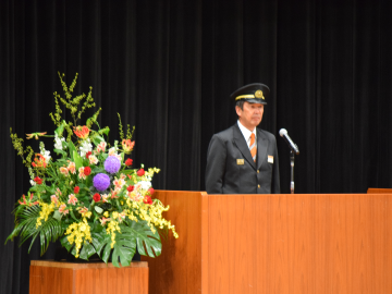 その後式典を文化会館で行いました。小栗市長様による式辞のあと桂川団長訓示、表彰と移りました。