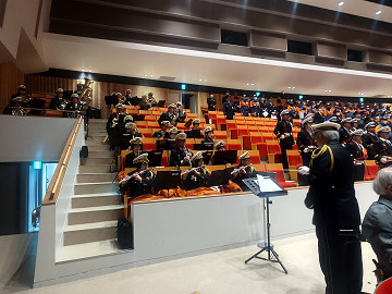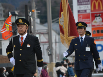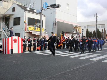 その後、正午より中津川駅前までを分列行進しました。強風のため、苗木分団階梯操法、音楽隊の演奏は中止となってしまい残念ででしたが、ラッパ隊の吹奏によって団長以下、力強い分列行進となりました。令和8年の無火災・無災害であることを祈りつつ、これからも中津川市消防団をよろしくお願いいたします。