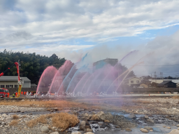 当日は朝から強風が吹く中、また午後からは小雪がちらつく中でしたが、盛大に挙行されました。当日は一斉放水が久しぶりに行われ、各分団が彩り鮮やかな放水を行いました。