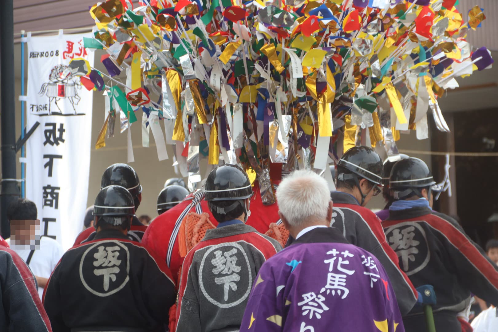 当日は色紙などで作られた「花」と呼ばれる串を背中に背負った馬が地区の3箇所から出発し、駅前で集合したのち、坂下神社に向かいます。