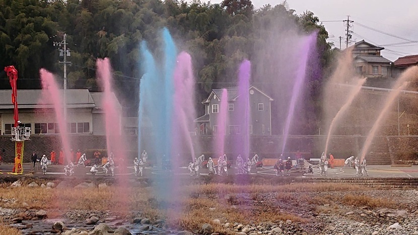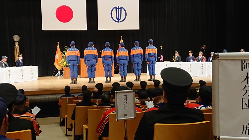 最初に一斉放水を行いその後、中津川市文化会館にて式典を行った後、都市緑地公園から駅前まで分列行進を行い多くの消防団が参加しました。